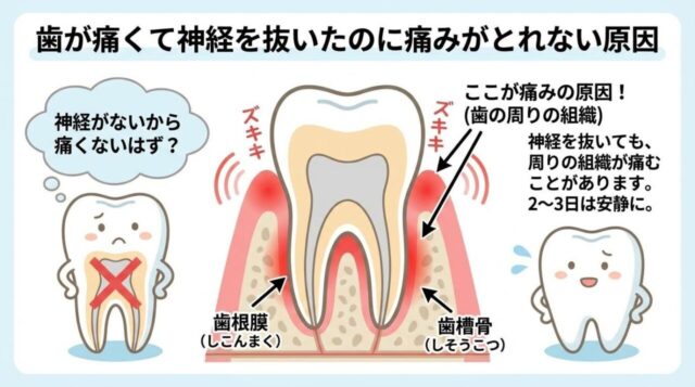 神経を抜いたにもかかわらず、歯を押すと痛い場合やズキズキと疼く場合、その原因は歯の神経だけでなく、歯の周囲組織(歯根膜や歯肉、骨)に痛みが波及している可能性があります。