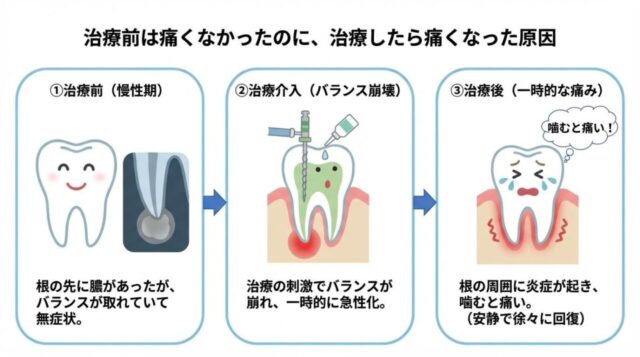 この場合は慢性的な病変ですので、悪いなりに体の中では安定した状態を保っていますが、根管を洗浄したり薬剤を貼薬することでバランスがくずれ、一時的に痛みが出る場合があります。