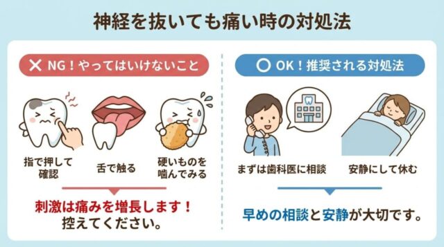 神経を抜いた後の痛みが気になる方は、まず安静にし、痛みが続く場合は早めに歯科医に相談してください。