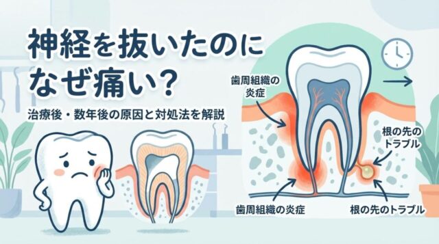 「昔、神経を抜いたはずの歯が、数年経っていきなり痛み出した」というケースも少なくありません。神経がないのに痛む主な原因は以下の通りです。