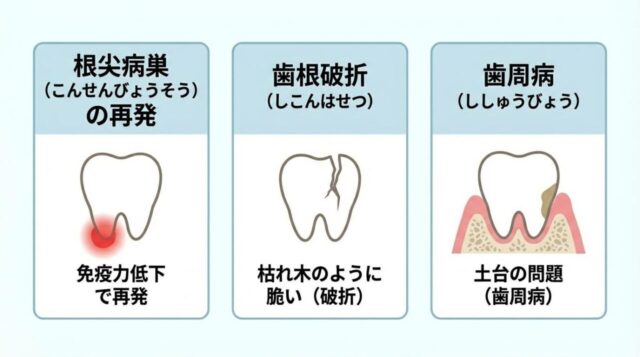 神経を抜いた歯は、水分や栄養が行き渡らなくなるため、枯れ木のように脆くなっています。長年の噛む力に耐えきれず、根っこにヒビが入ったり割れたりすることで、痛みや腫れを引き起こします。