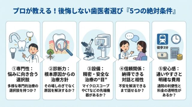 その代わりに、私たちが考える「恵比寿で歯医者さんを選ぶ、後悔しないための“5つの絶対条件”」をご紹介します。